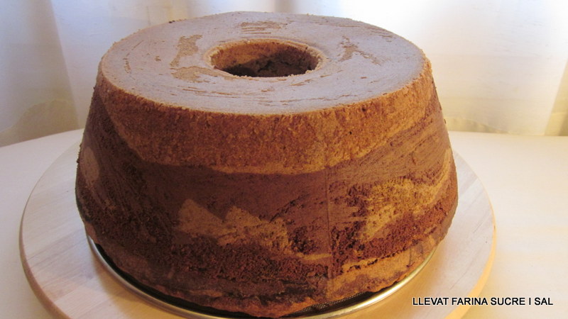 Aquest pastís l’he fet, afegint 150 c.c d’aigua bullint i 12 cullerades de cacau amarg a la recepta de la Rosca Gallega