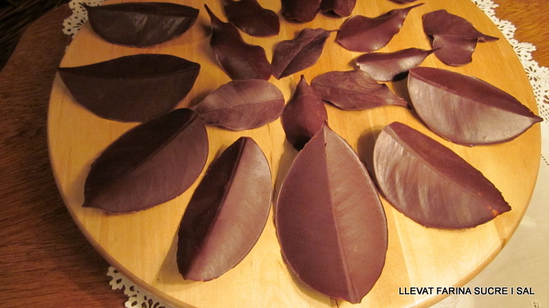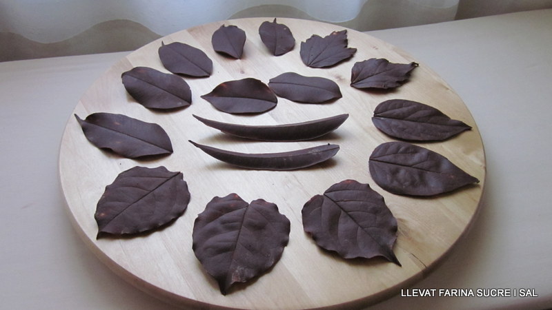 Diferents tipus de fulles fetes amb xocolata, les del davant són Bougainvilleas, les del mig són de Ficus Ilii i les del darrera de Ficus Benjamina.