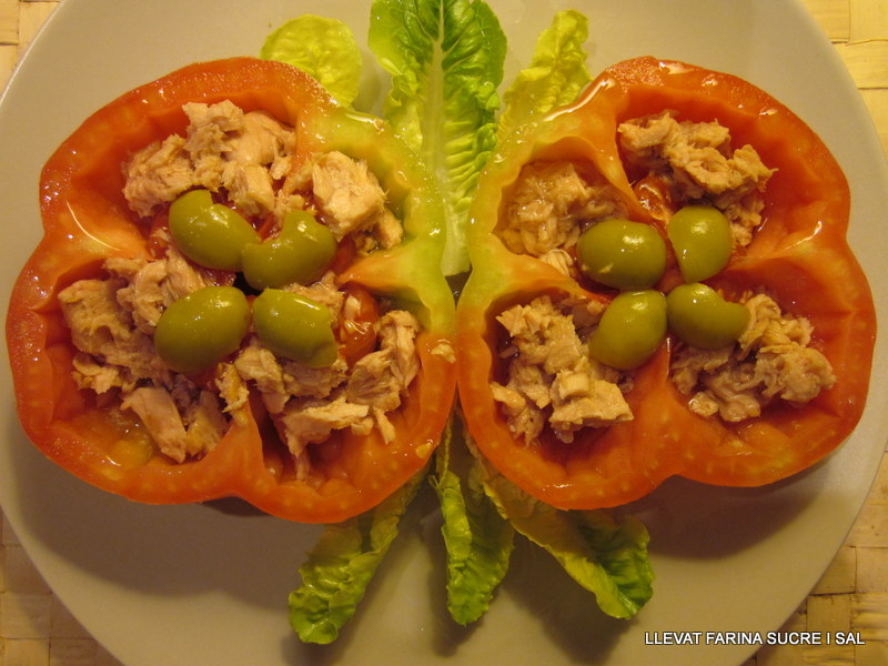 TOMÀQUETS DE COLOR DE ROSA Posted on 05/09/2012 by conxipros 0 Una amanida de luxe !!! Ingredients i preparació : 1 tomàquet de color de rosa, net, tallat per la meitat, una llauneta de tonyina de la bona, quatre olives, una mica de sal i un bon rajolí d’oli d’oliva. Bon profit !!! Comparteix això: Feu clic per compartir a X (S'obre en una nova finestra) X Feu clic per compartir al Facebook (S'obre en una nova finestra) Facebook Feu clic per imprimir (S'obre en una nova finestra) Imprimeix M'agrada S'està carregant... Relacionats