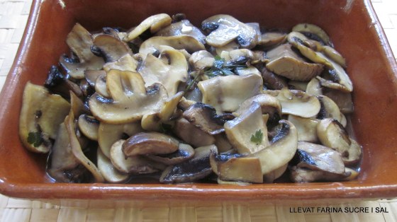 Posem una paella al foc, afegim els bolets i deixem que perdin l’aigua, llavors afegim una mica d’oli i posem els alls, els daurem una mica i seguidament el julivert, salem, ho saltegem tot plegat i ja són fets.