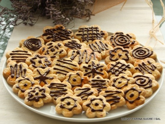 Per fer aquestes galetes, farem la recepta de les Galetes de mantega, desferem una mica de xocolata negra de cobertura i amb una màniga pastissera, decorarem al nostre gust.