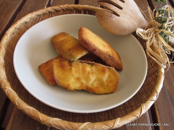 Un per un, anem treien els talls de carbassó de la mescla a l’anglesa, els anem passant pel pa ratllat i els posem damunt d’un paper de cuina, llavors aboquem l’oli en una paella al foc, quan estigui calent hi anem fregin els talls de carbassó, deixem que es dorin i els tombem amb cura, per què no es trenqui l’arrebossat. Els que ja són fets, els anem deixant al damunt d’un plat amb paper de cuina , així mai queden oliosos.