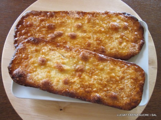 Deixem el mateix paper que  porta, tallem la làmina per la meitat més llarga i posem les dues parts amb el paper damunt de la safata del forn, una al costat de l’altre arrodonim una mica les cantonades, els hi posem un grapat de sucre de dalt a baix i amb amb el setrill els hi fem una bona sucada d’oli.