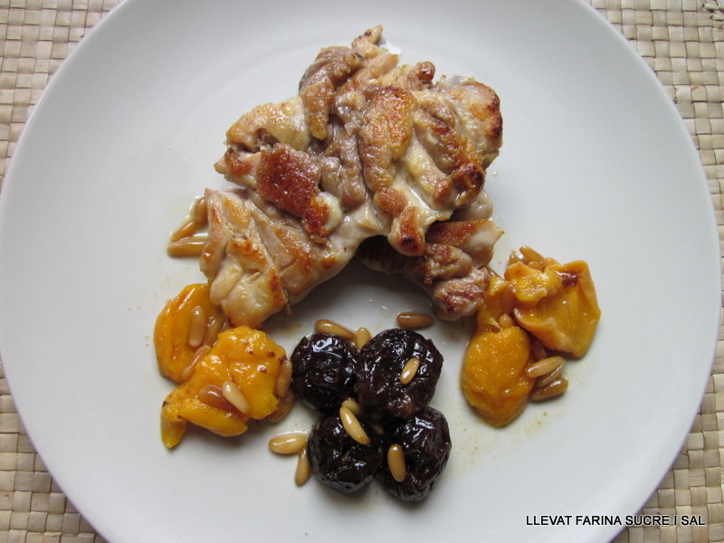 Muntem el plat amb les cuixes desossades, els hi posem un rajolí d’oli pel damunt i l’acompanyament d’orellanes d’albercoc, prunes i pinyons.