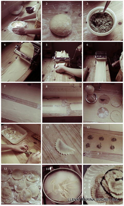 Posar la làmina de pasta damunt d’una superfície enfarinada, fer petites muntanyetes de farcit i tallar amb el talla-pastes.
