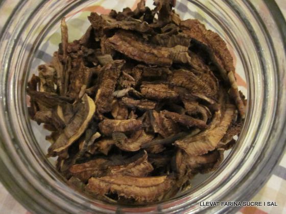 En un bol, remullem els ceps amb aigua tèbia, fins que ens sembli que estan al punt, els escorrem i els reservem.