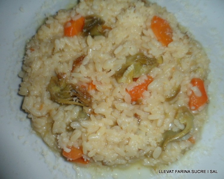 Treiem l’all, tirem l’arròs i sense parar de remenar, anem posant el vi, salem, anem posant la quantitat necessaria d’aigua, però fins que el primer cullerot no l’hagi begut l’arròs, no posem el segon, sempre remenant i així fins que veiem que l’arròs és gairebé cuit, llavors afegim el formatge ratllat i la mantega, remenem i el deixem reposar uns minuts.