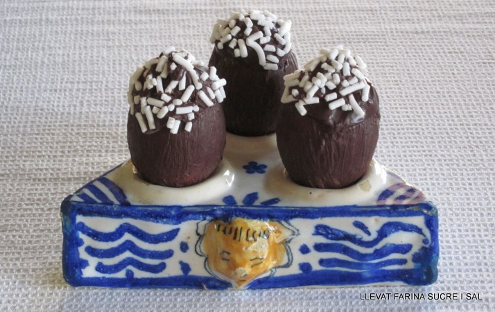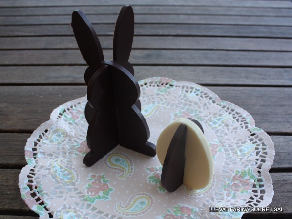 Aquí us deixem idees per a decorar les mones, amb gema cremada i ametlles, amb ganache de xocolata i aquests ous i conills de xocolata, tenyida amb colorants alimentàris, fets amb uns motllos en 3D, de silicona de Lekué.
