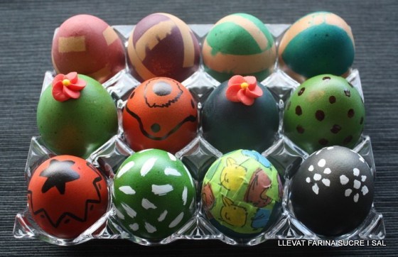 Podeu posar retalls de cinta adhesiva, als ous i posar a bullir, en aigua amb colorant, per obtenir colors variats, després decorar-los amb retolador i flors de sucre.