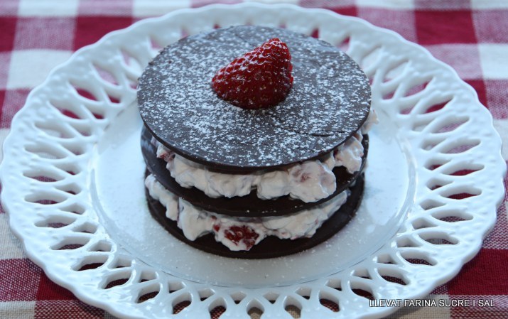 En un plat, posar una rodona i damunt una mica de nata amb maduixes i repetir les vegades que vulguem.