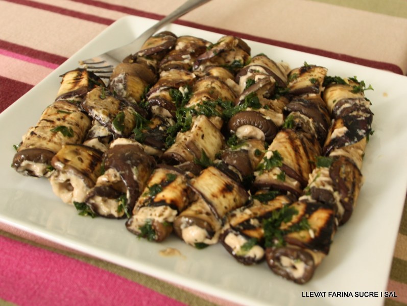 Fins i tot les albergínies les podem coure a la planxa el dia abans, les posem en un plat pla, les tapem amb film de cuina i les deixem a la nevera. Abans de farcir-los, els hi passem una goteta d’oli per les dues bandes, una mica lluents queden més bonics. Els hi posem dues culleradetes del preparat de maionesa, els enrotllem i els col-loquem a la safata de servir.