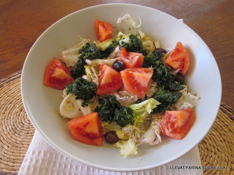 En un bol, posem escarola tallada, el tomàquet, unes montanyetes d’espinacs i ho amanim amb sal, vinagre de Mòdena i l’oli d’oliva. Posem les olives negres i ja la tenim a punt.