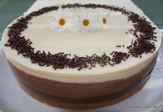 Per posar la segona capa ( xocolata amb llet ), ratllar superficialment, amb una forquilla la capa de xocolata blanca, perqué no ens rellisqui i amb una cullera del revés, anar abocant suaument la mescla.
