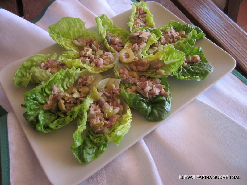 Tallem a dauets petits, la ceba tendra, les olives farcides, el cogombre i l’hi barregem la tonyina, salem una mica i afegim unes gotes de vinagre.