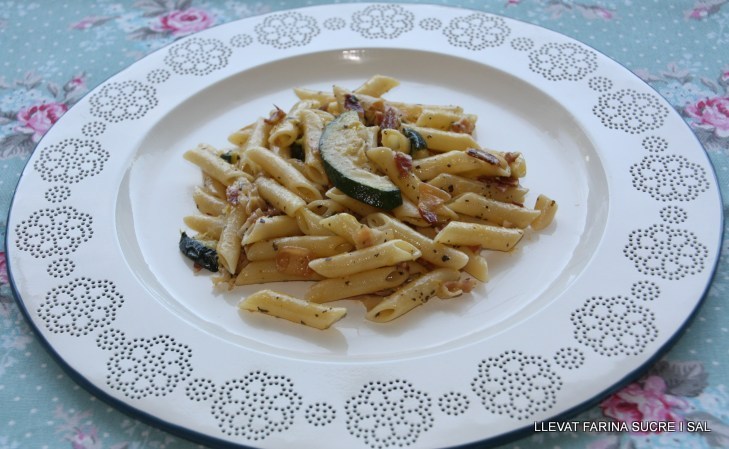 Mesclar els macarrons amb el carbassó i el bacó.