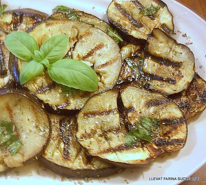 Rentem i tallem les albergínies a rodanxes, no massa primes, posem la planxa al foc i deixem que agafi temperatura, les salem i anem posant les rodanxes a la planxa, els hi donem la volta i quan les veiem cuites, les anem posant en una safata plana, fins que estiguin totes fetes.