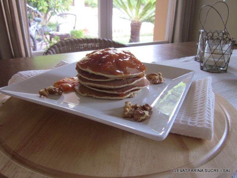 Pancakes fets pel meu net Pierluigi, per berenar avui a casa, farcits de nous picades i banyats de melmelada d’albercoc feta per la nostra amiga Tere !!