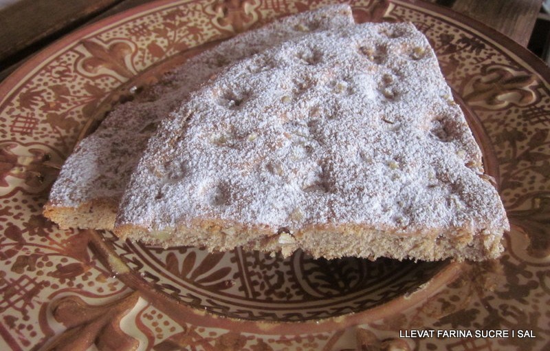 Escampem les nous pel damunt del pastís i l’enfornem, uns 30 minuts, el punxem per saber si és cuit.