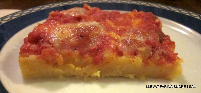 Posem l’olla al foc amb l’aigua, quan bulli afegim la sal, i la polenta a raig de pluja perquè no es facin grumolls, i remenem tot abocant el bacó fregit i el seu greix, així la polenta queda més gustosa. La col-loquem ben plana dins d’una safata apta per forn,al damunt hi posem la salsa de tomàquet, el formatge ratllat, la mozzarella tallada a làmines i l’ enfornem.