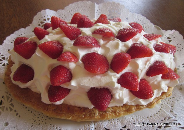 Omplim el motllo de pasta de full amb la nata, sense aixafar-la gens, i l’anem decorant amb les maduixes tallades per la meitat.
