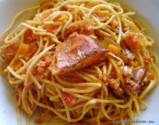 Passem la pasta ben escorreguda a la cassola del sofregit, li donem unes quantes voltes i ja la podem servir.