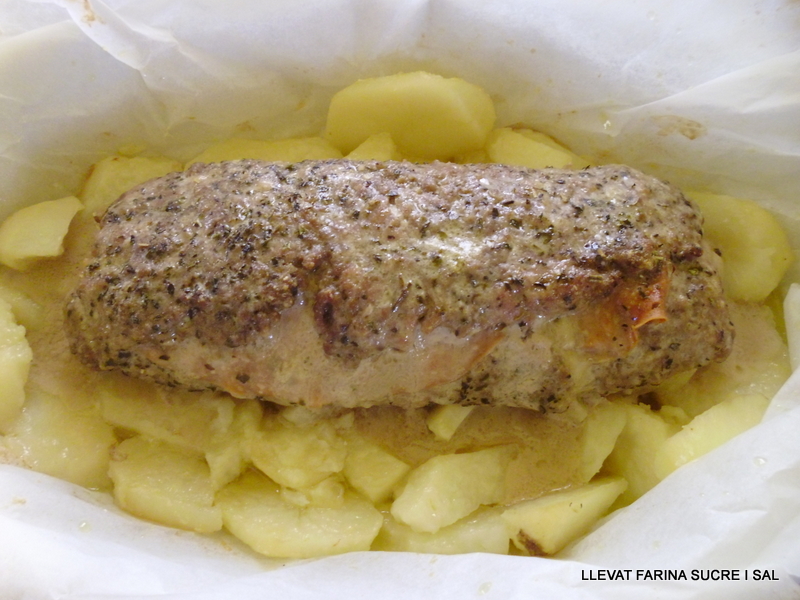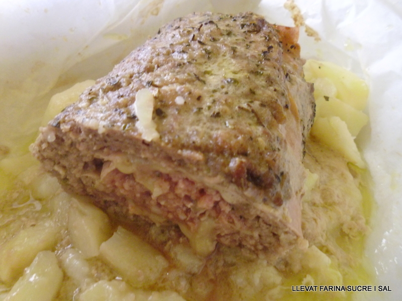 Tallem un tros de paper de forn, posem la carn picada a sobre, l’aplanem amb les mans i li donem la forma rectangular, si la seva textura ens agrada, la farcim amb l’embotit que més ens agradi ( la de la foto és amb mortadela) i afegim el formatge ratllat o el de fonfre. Amb el mateix paper de forn l’anirem enrrotllant, per donar-li la forma de “braç de gitano”, si les patates les veiem ja una mica fetes, posem la carn al damunt i que es fagi tot junt, ho anem controlant, punxant les patates i la carn, i la deixem que es dauri una mica.