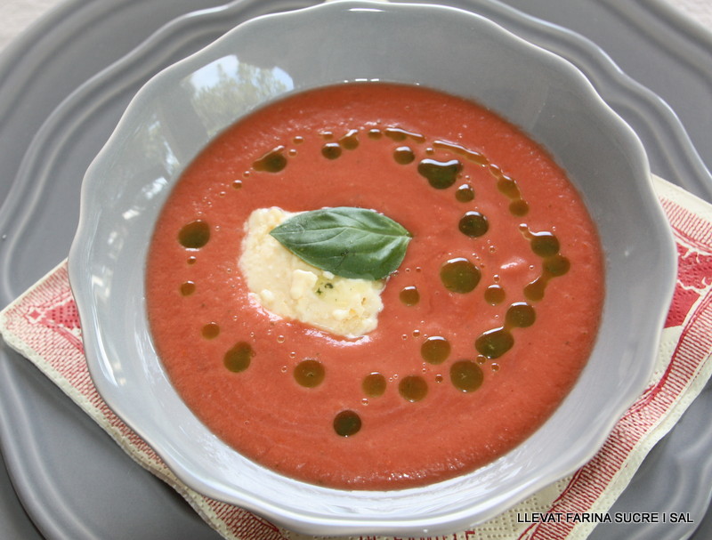 Servir la sopa en un bol, posar una canelle de gelat i unes gotes d’oli d’alfàbrega i decorar amb una fulla fresca .