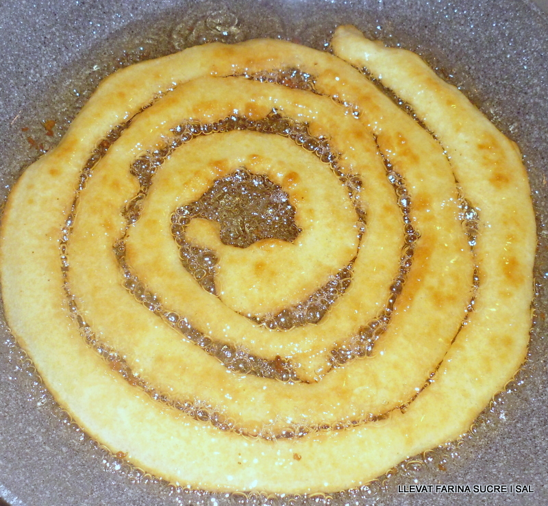 Posem una paella amb oli al foc, quan estigui calent, omplim l’embut amb la pasta i fem moviments ciculars de dins cap a fora, com un cargol, quan les “cattas ” estan daurades les treiem i les passem en una plata amb sucre, regirant-les de tots costats.