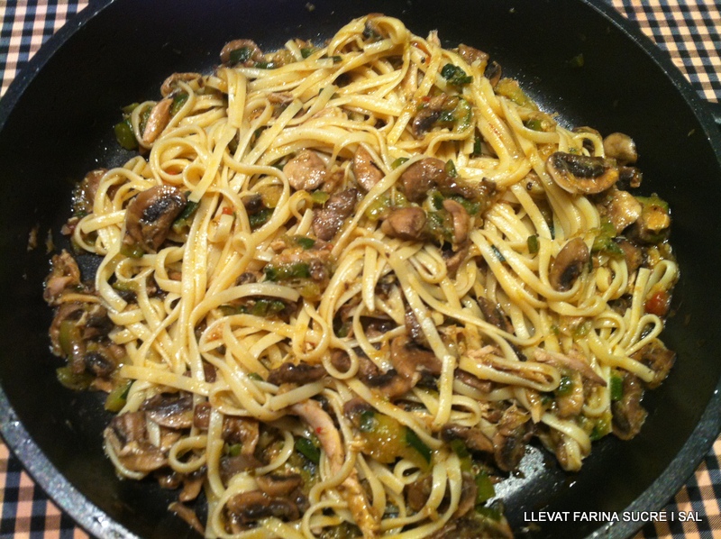 En la mateixa olla de bullir la pasta, posar el sofregit, escalfar una mica i abocar la pasta al damunt.