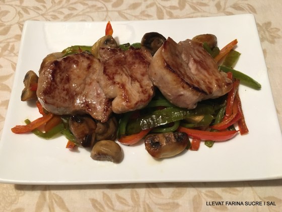En la mateixa paella de les verdures, posem el foc fort i marquem la carn ( deixant-la al punt que us agradi ).