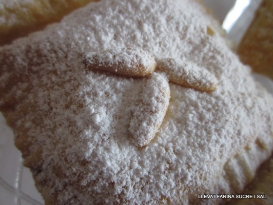 Farcim els quadrats de cabell d’àngel, tapem amb una altra peça de full, segellem els laterals amb una forquilla ben apretadets i posem 3 pinyons damunt .