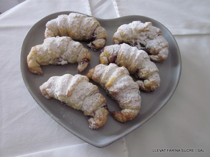 Iniciem per la part ampla del croissant i anem cargolant fins a la punta, dobleguem suaument les puntes amunt i només falta pintar-los amb el rovell d’ou batut amb unes gotes d’aigua.