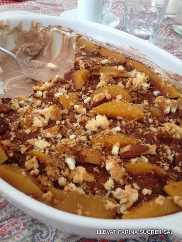 En una safata de 4 cms. de fondo, posem una capa de gelat tres sabors, al damunt posem trossets del pa de pessic, coca de brioxe o melindros dels tous, tornem a posar gelat i anem fen capes fins que acabem el gelat, a sobre espolvorem el cacau i anem posan pels voltants préssec en almívar tallat a miitges llunes (no massa gruixudes) posem també préssec a la part del centre i engrunes grosses de pa de pessic, coca de briox o melindros….queda una safata de gelat maquíssima i deliciosa.