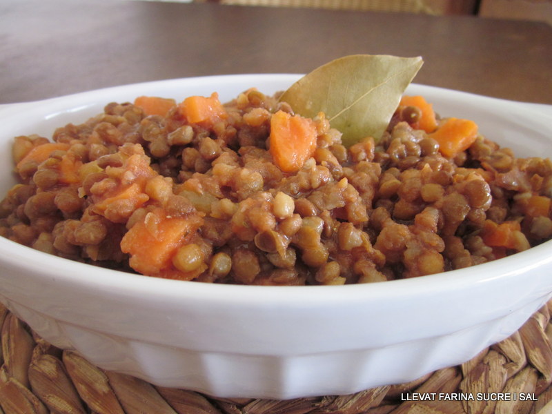 Posem les llenties en el mateix cassó, amb el suc de les pastanagues i de les patates, una fulla de llorer, el xoriço tallat petit, salem i deixem arrancar el bull un moment, les remenem i apaguem el foc, deixem reposar uns minuts.